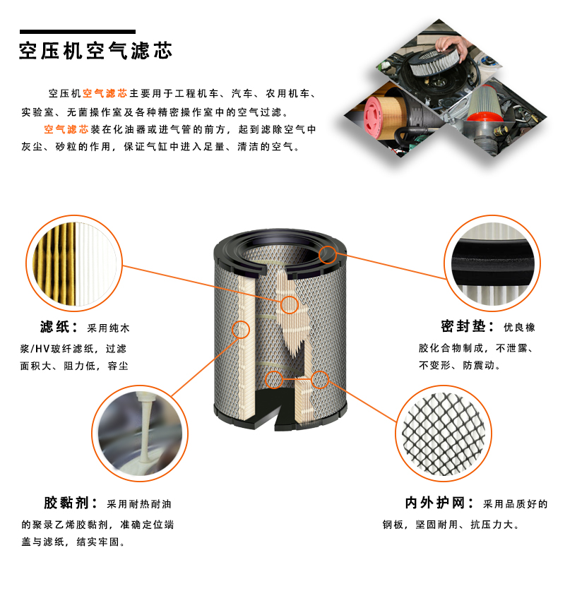 發(fā)動機(jī)在工作過程中要吸進(jìn)大量的空氣,如果空氣不經(jīng)過濾清,空氣中懸浮的塵埃被吸入氣缸中,就會使活塞組及氣缸的磨損。較大的顆粒進(jìn)入活塞與氣缸之間,會造成嚴(yán)重的"拉缸"現(xiàn)象,這在干燥多沙的工作環(huán)境中尤為嚴(yán)重。02250131-495 空壓機(jī)一頭通空氣濾芯裝在化油器或進(jìn)氣管的前方,起到濾除空氣中灰塵、砂粒的作用,保證氣缸中進(jìn)入大量、清潔的空氣。