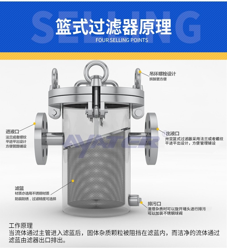 產品描述:籃式過濾器,不銹鋼籃式過濾器,污水處理設備,工業過濾器,大流量過濾器 籃式過濾器主要由接管、主管、濾籃、法蘭、法蘭蓋及緊固件等組成。當液體通過主管進入濾籃后,固體雜質顆粒被阻擋在濾籃內,而潔凈的流體通過濾籃、由過濾器出口排出。當需要清洗時...